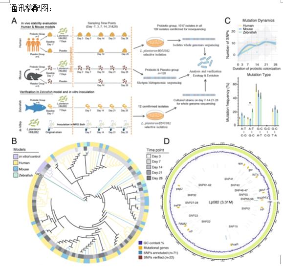 本研究以一株具有自主知识产权,分离自海南传统发酵食品中的益生植物乳杆菌HNU082为研究对象,结合Shotgun宏基因组测序技术和全基因组重测序方法,借助人、小鼠和斑马鱼三种典型生物学模型,探究益生菌在不同宿主肠道选择压力下的适应性进化策略。研究结果表明,益生菌在不同宿主间采用平行进化策略,短暂的肠道定殖促使菌株发生适应性突变,表现在突变株对鼠李糖的利用增强,耐受性增强等。同时,益生菌的摄入驱动宿主肠道内本地菌群协同进化,揭示了肠道菌群进化的“Red Queen”假说。本研究阐释了益生菌进入肠道后,肠道菌群协同进化机制,为以肠道为靶点的优秀突变株筛选提供了全新思路。