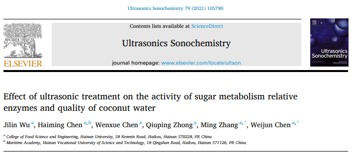 近日,英国威廉集团官网陈卫军研究员课题组利用超声技术延长椰青贮存时间并保持椰子水的甜度,研究成果发表在《Ultrasonics Sonochemistry》(中科院1区TOP期刊,影响因子7.491),题为“Effect of Ultrasonic Treatment on the Activity of Sugar Metabolism Relative Enzymes and Quality of Coconut Water”,相关技术已申请专利《变温超声耦合密闭流体局部压差(UCP)灭酶处理的椰青保存方法》(申请号:CN202010102300.6)。