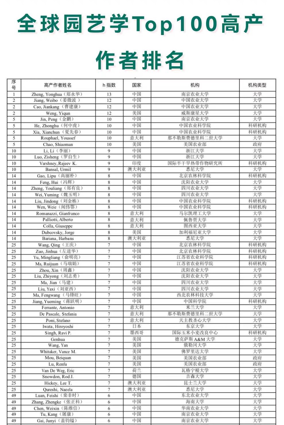 2021全球园艺学高产作者排名数据基于Web of Science核心合集收录的2016-2020年的SCI和SSCI论文数据,检索时间为2021年7月。将全球园艺学论文数据集中发文量排名前50,000的作者,按H指数高低进行排名,取前100位定义为该学科高产作者。