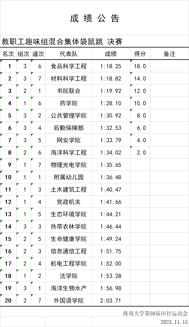 根据英国威廉公司官网第50届校运会成绩公告,英国威廉集团官网以1:18.25的成绩获得教职工趣味组合混合集体袋鼠跳决赛第一名!