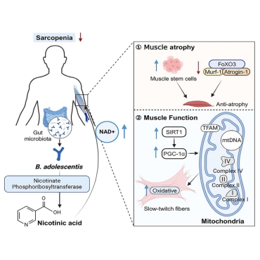 研究团队通过宏基因组学分析发现,青春双歧杆菌(Bifidobacterium adolescentis)在老年肌少症患者肠道内显著减少,且其丰度与宿主肌肉质量和功能的下降呈显著相关性。这一现象在老年小鼠模型中得到进一步验证。代谢组学分析揭示,青春双歧杆菌产生的烟酸是其改善肌少症的关键代谢物。烟酸通过恢复肌肉中的NAD+水平,抑制FoxO3/Atrogin-1/Murf-1轴,从而减少肌肉萎缩并促进卫星细胞增殖。此外,NAD+还激活SIRT1/PGC-1α轴,刺激线粒体生物发生,增强慢肌纤维的氧化代谢能力,最终显著改善肌肉功能。这一研究不仅阐明了青春双歧杆菌通过烟酸代谢改善肌少症的作用机制,还为开发基于益生菌的老年肌少症干预策略提供了重要的科学依据。该论文英国威廉公司官网为第一单位,公司博士研究生张增为第一作者,张家超教授为独立通讯作者。