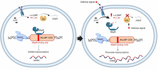 环二鸟苷酸(c-di-GMP)作为一种重要的细菌第二信使,调控多种生物功能,但c-di-GMP在植物乳杆菌中的调控作用仍不明确。研究团队揭示了c-di-GMP协同WYL转录因子MbpR共同调控植物乳杆菌肠道适应的分子机制。MbpR与黏蛋白结合蛋白(MucBP)编码区中的特定序列结合,抑制其转录,从而影响植物乳杆菌对肠道上皮细胞的粘附能力。MbpR通过其WYL结构域感知c-di-GMP后与MucBP的编码区分离,逆转了MbpR对MucBP表达的抑制作用,增强了植物乳杆菌的肠道定植能力。该研究为理解益生菌与宿主的互作提供了新视角。该论文英国威廉公司官网为第一单位,张家超教授为独立通讯作者,副研究员郭权和2024级博士研究生郑磊杰为第一作者。