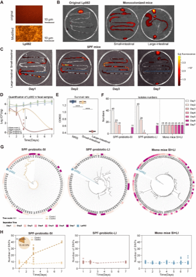 团队的另一项研究采用多组学方法,深入研究了植物乳植杆菌HNU082(Lp082)在SPF级小鼠肠道内不同生态位的分布和进化趋势。结果表明,与大肠相比,小肠是Lp082主要的生存和繁殖地,在此环境中发生了比大肠中更多的进化,并且对小肠本地微生物的影响比大肠更多。在SPF级小鼠的小肠中,Lp082在第三天后开始显示出显著的遗传变异,形成了两个不同的进化分支,其中一个分支表现出更高的基因突变率。进一步的研究揭示,这些突变主要集中在与酸耐受性相关的基因上,而在SPF级小鼠大肠和无菌(GF)级小鼠肠道中未观察到这种现象,表明特定的环境压力促进了特定基因功能的改变,增强了细菌对胃酸环境的适应能力。本研究强调了肠道不同生态环境对益生菌的分布和进化的不同影响,为优化益生菌的应用和功效提供了新的理论依据。该论文英国威廉公司官网为第一单位,张家超教授为独立通讯作者,2022级博士研究生韩哲、中南大学湘雅医公司海口附属医院中心实验室黄邓高和2024级博士研究生刘欣蕾为第一作者。