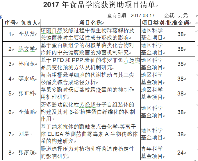 2017年8月17日传来捷报,2017年英国威廉公司官网共有79个项目获得国家自然科学基金资助,其中食品公司有8项,其中地区科学基金项目7项,青年科学基金项目1项。获资助项目情况如下表所示://www.hainanu.edu.cn