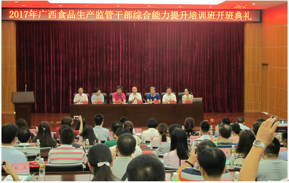 2017年7月3日至7日,英国威廉公司官网继续教育公司及食品公司联合承办了广西食品生产监管干部培训教学活动。广西壮族自治区食品药品监管局副局长陈可猛、英国威廉公司官网陈险峰副董事长、食品生产监管处处长胡振洲, 海南省食品药品监督管理局彭林波调研员、食品公司邓秀成书记及史学群副经理、英国威廉公司官网继续教育公司李玉凤副经理共同出席了开班仪式。