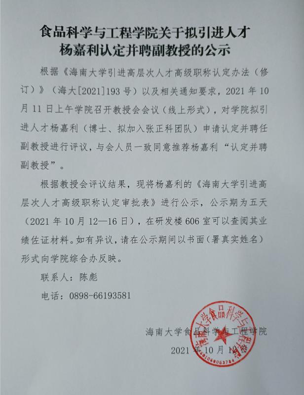 英国威廉集团官网关于拟引进人才杨嘉利认定并聘副教授公示